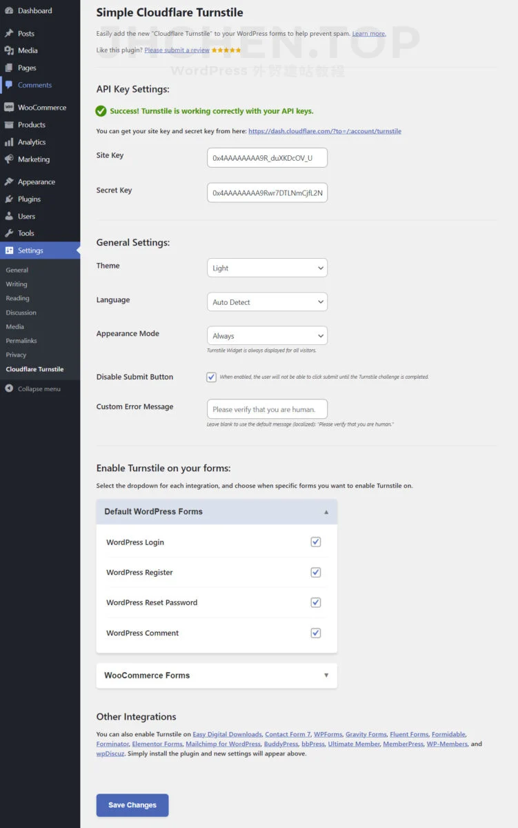 和所有 Cloudflare 服务一样,把你在 Cloudflare Turnstile 建的网站密钥和私钥填进去就行。填好之后,它就可以自动帮你给各种表单加上 Turnstile 验证,不用你一个个设置。